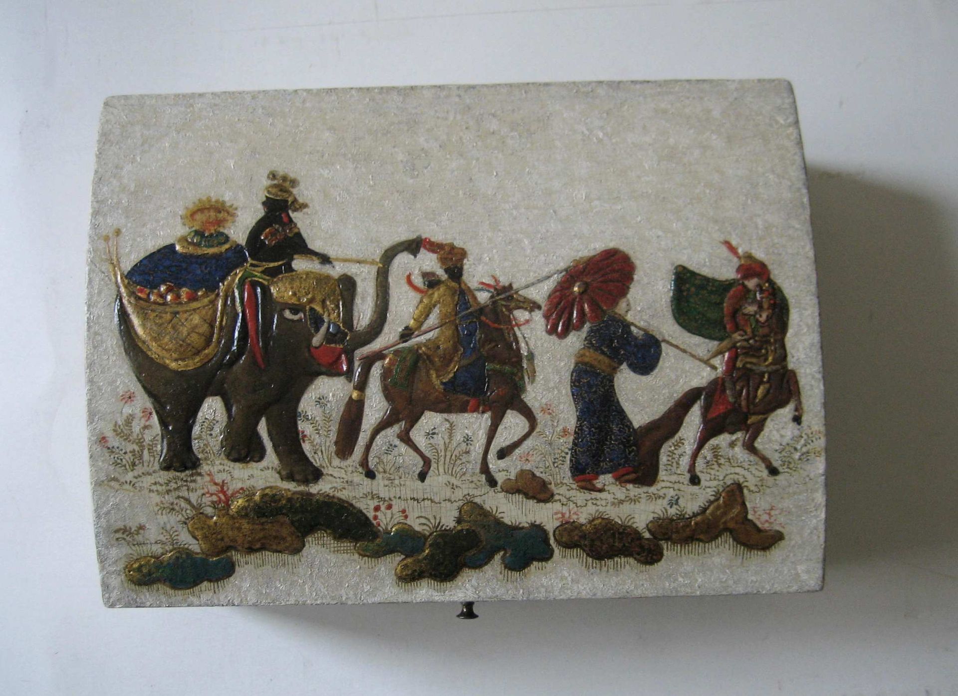 Sachsen, 18. Jh. Rokoko-Holzkästchen, weiß gefasst, mit buntem reliefartigem Chinoiserie-Dekor. Zustand nach der Restaurierung (nach Reinigung; geklebter Deckelholzriss, Fassungs- und Dekorausbrüche gekittet und retuschiert).