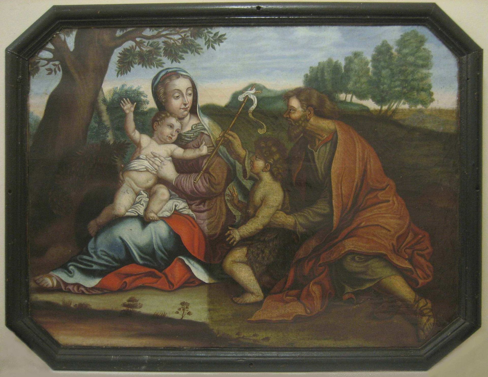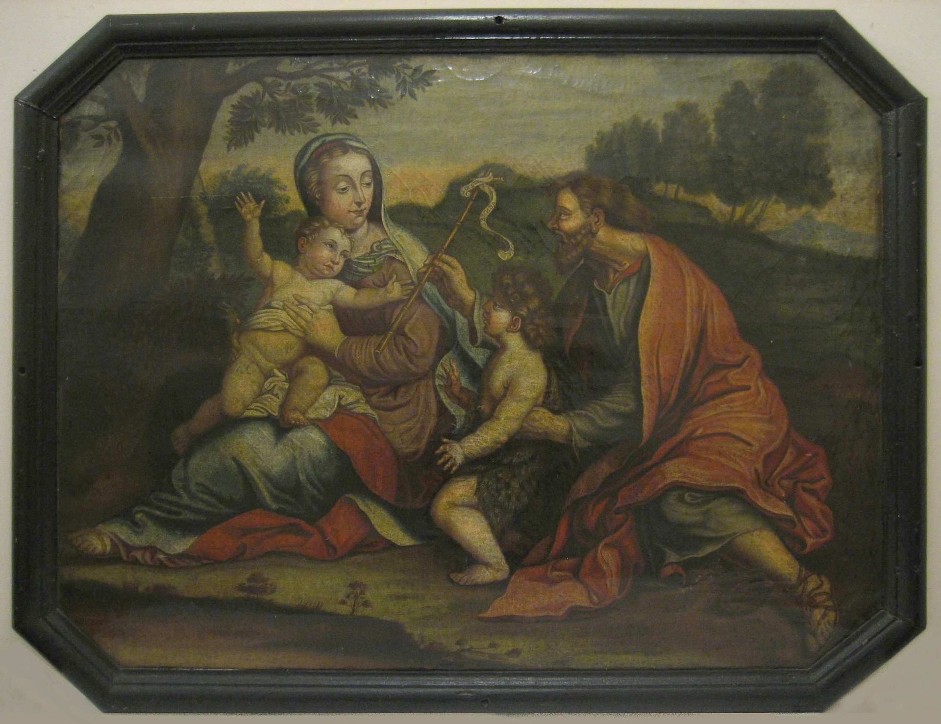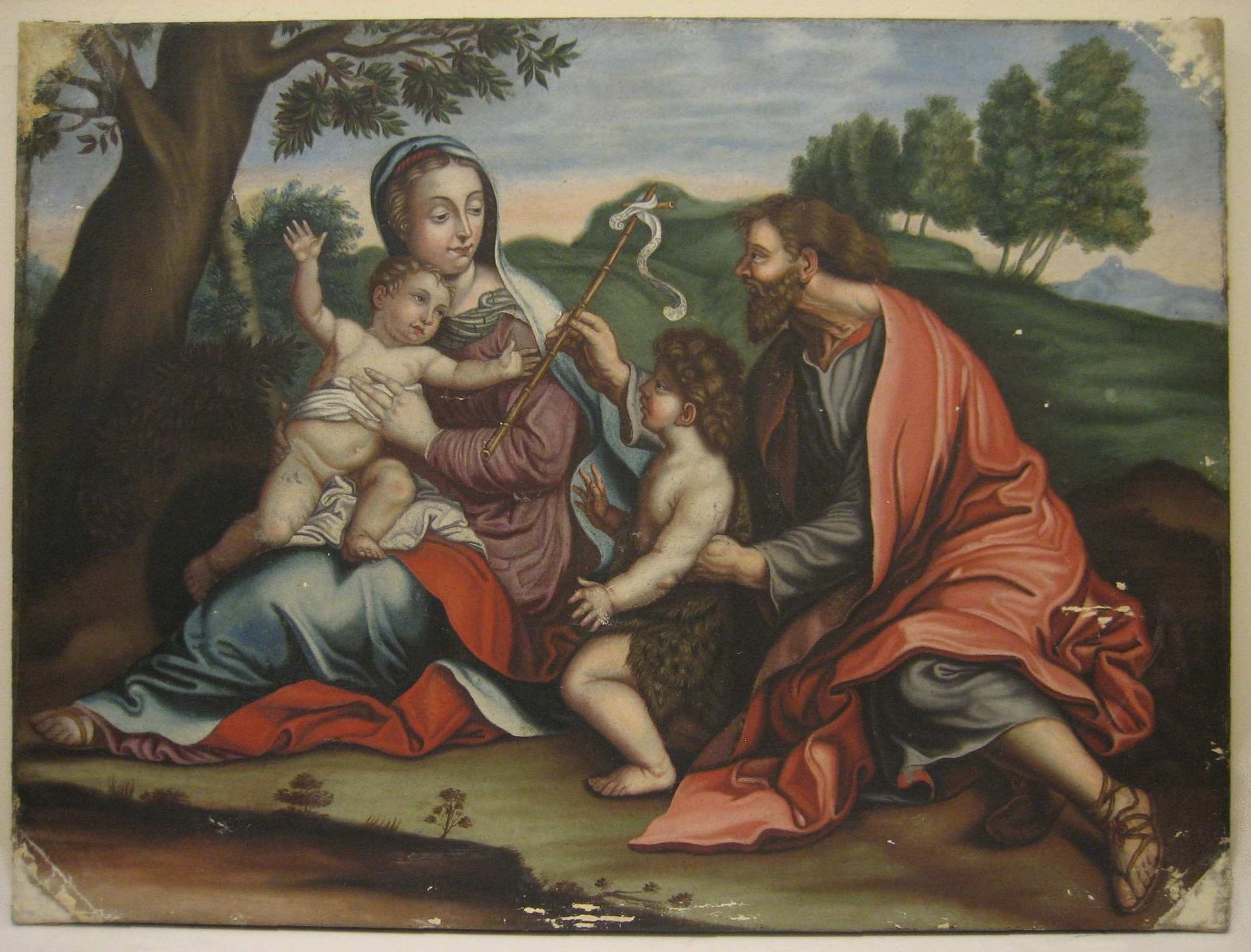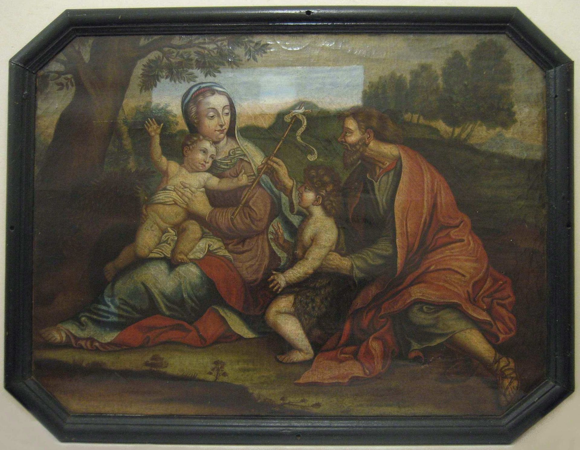 Kirchenmaler, 18. Jh. “Hl. Familie mit Johannes d. Täufer”. Öl auf Leinwand. Zustand nach der Restaurierung.