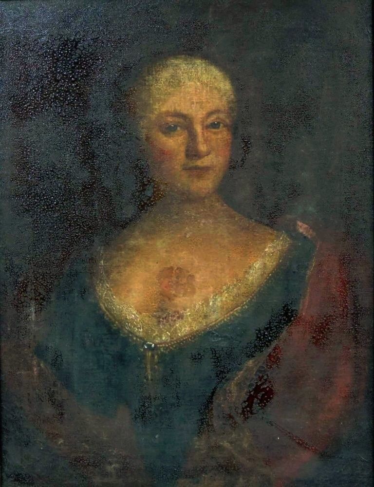 Deutscher Maler, um 1750 "Bildnis der Gräfin von Ostein". Öl auf Leinwand. Zustand vor der Restaurierung (kleisterdoublierte Leinwand mehrfach beschädigt und deformiert; Malschicht instabil, mehrere Übermalungen, besonders in der Kopf- und Gewandpartie).