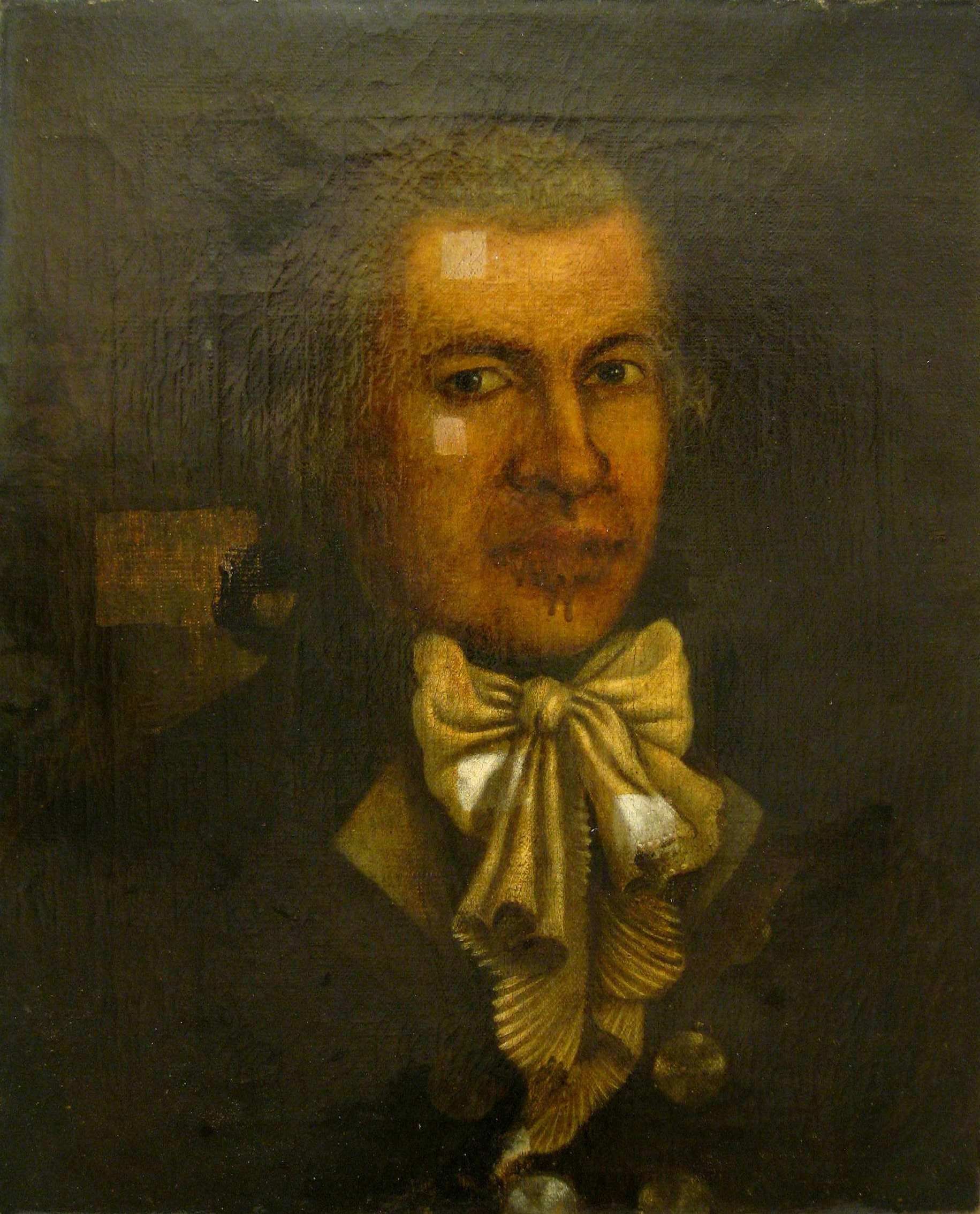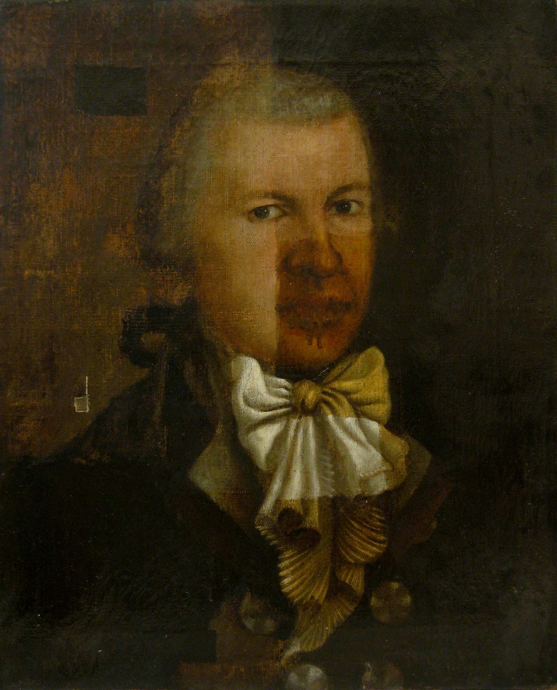 Bildnismaler, Ende des 18. Jh. „Bildnis eines jungen Herren Bonanni". Öl auf Leinwand. Zustand während der Restaurierung (nach Reinigung; Leinwandrisse und Leinwandlöcher geschlossen und gekittet; vor Retuschen).