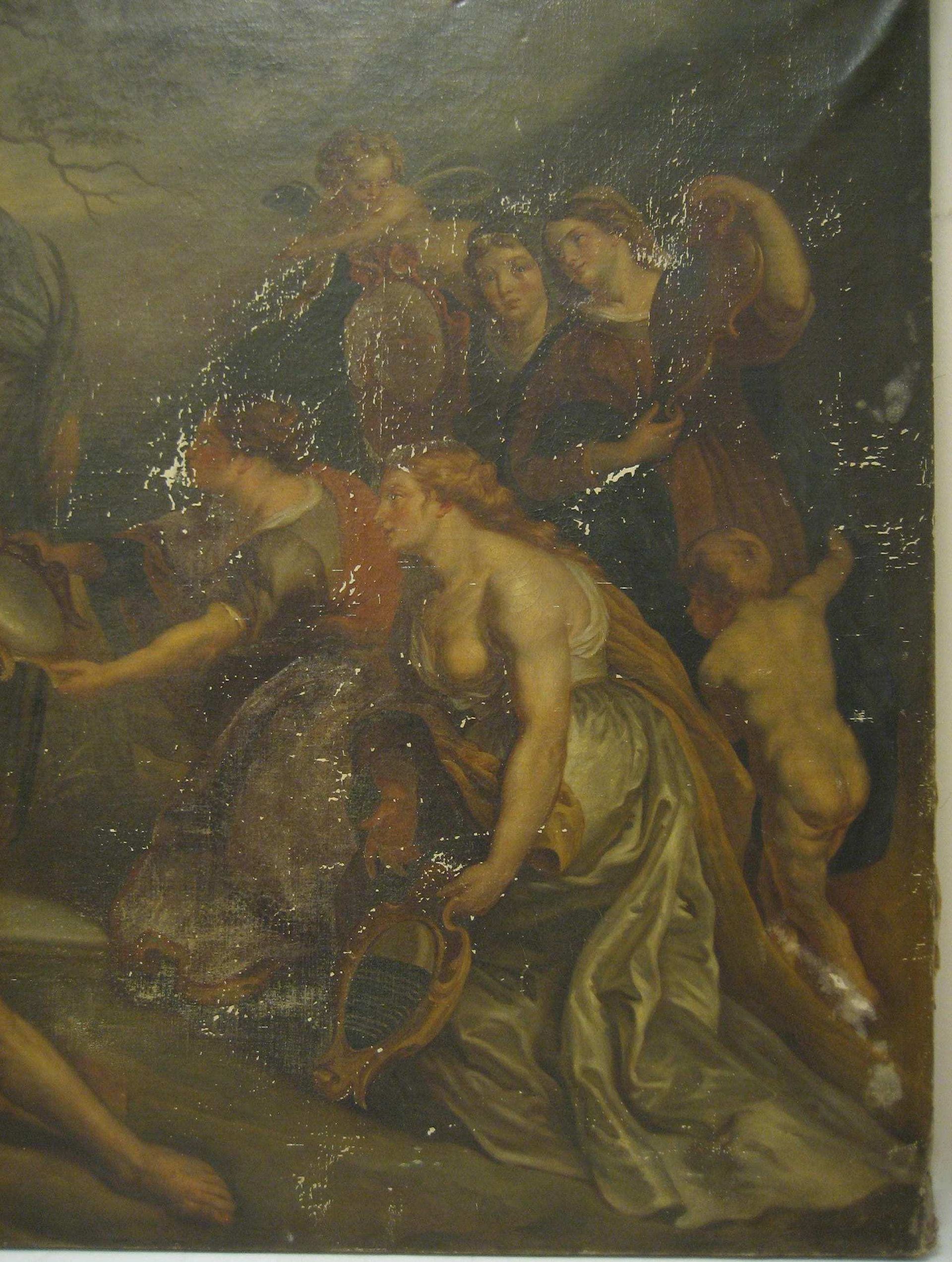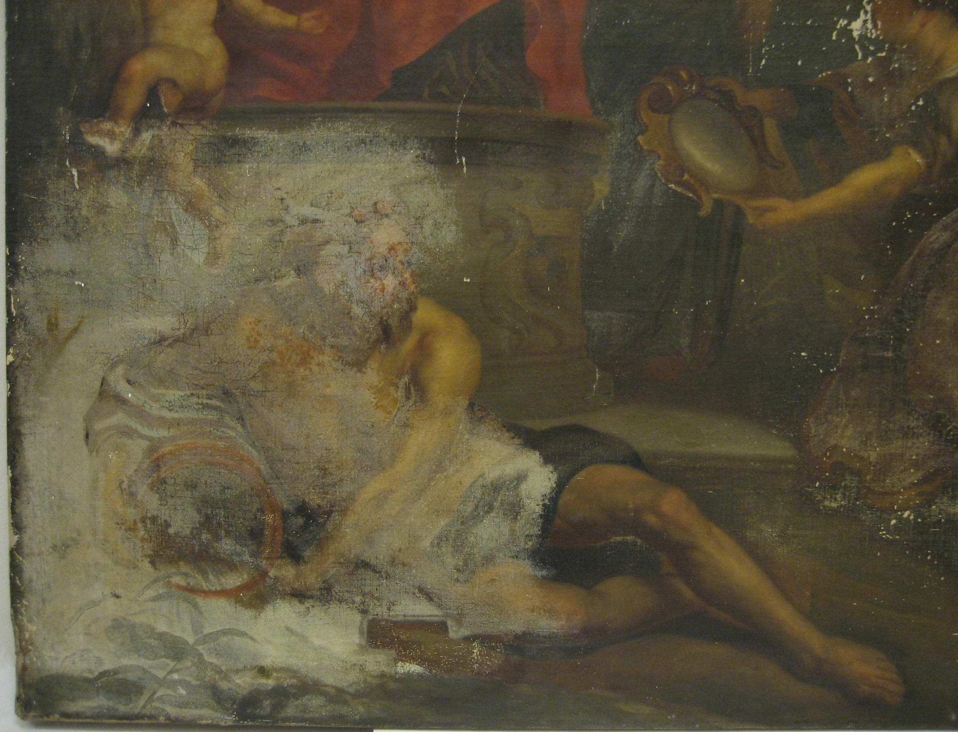 Akademischer Maler nach Rubens, Ende des 19. Jh. „Allegorie der Gerechtigkeit“, Öl auf Leinwand. Zustand vor der Restaurierung. Detailaufnahme (Malschicht partiell spröde und mit massiven Ausbrüchen).