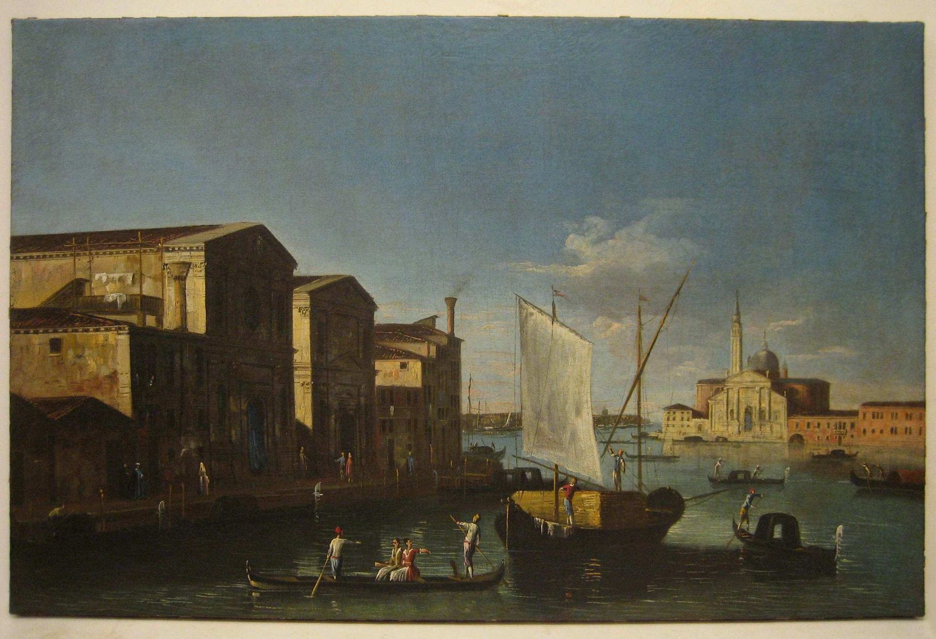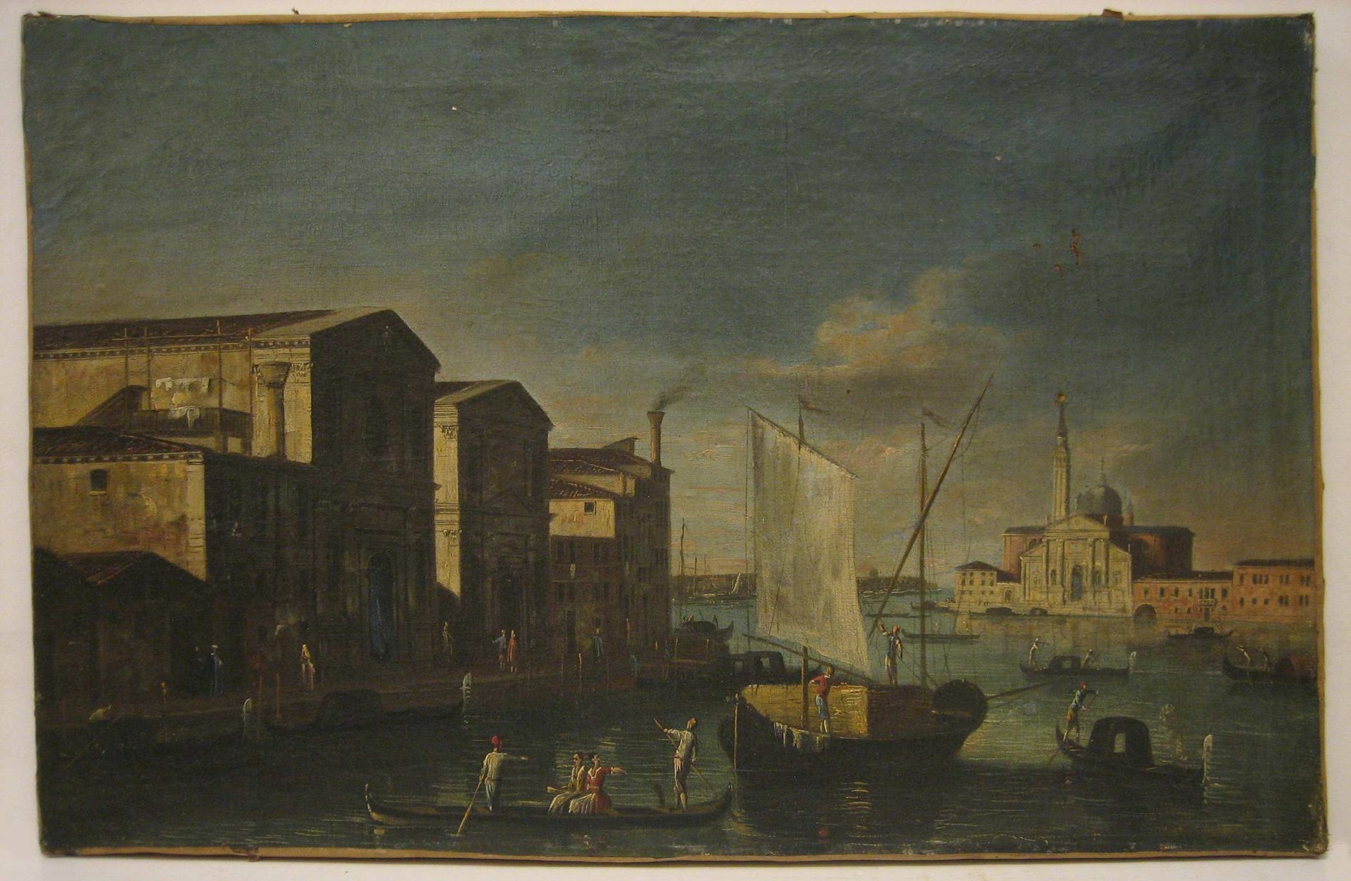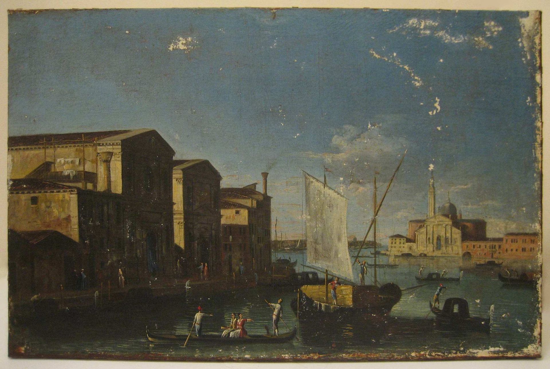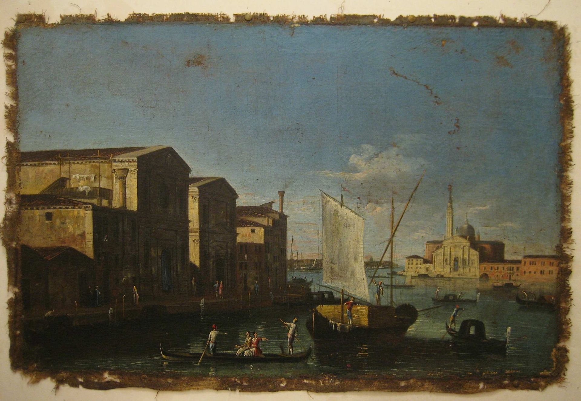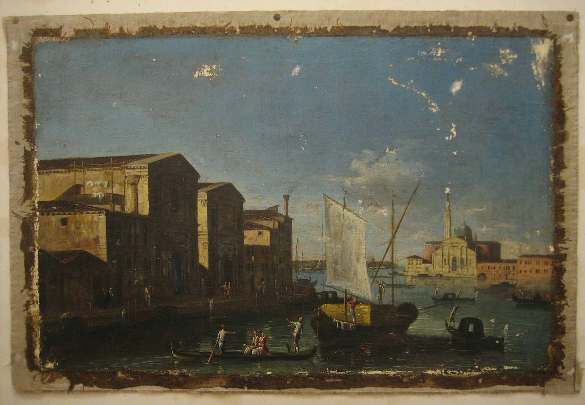 Venedig-Maler, Ende des 18. Jh. "Vedute mit S. Giorgio Maggiore“. Öl auf Leinwand. Zustand vor der Restaurierung (Bildoberfläche verschmutzt, Firnis vergilbt, Retuschen und Übermalungen; alte Kleisterdoublierung, Leinwand gewellt, Spannrahmen beschädigt).