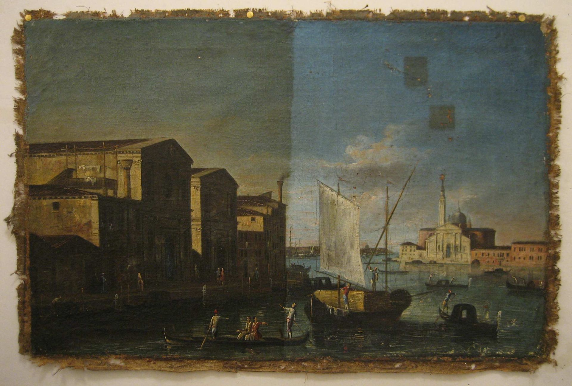 Venedig-Maler, Ende des 18. Jh. "Vedute mit S. Giorgio Maggiore“. Öl auf Leinwand. Zustand während der Restaurierung (nach Abnahme vom Spannrahmen und nach dem Entfernen der Doublierleinwand; nach Teilreinigung).